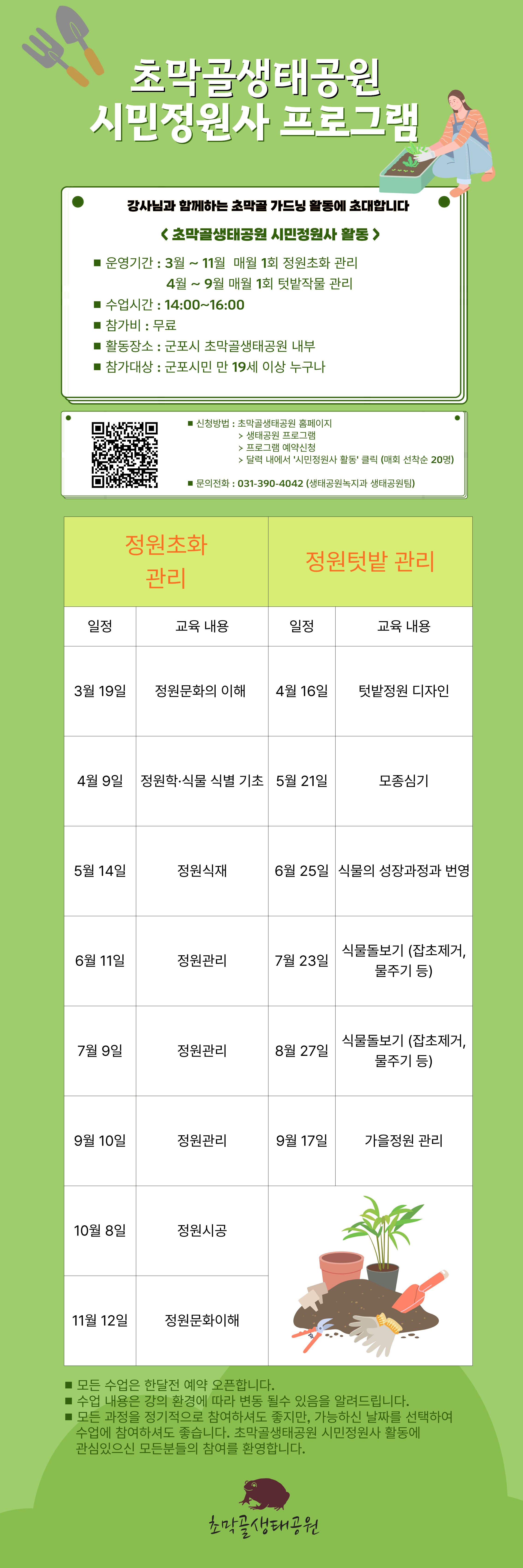 | 소개 | < 시민정원사 활동 > 접수안내 ○ 매차시별 프로그램 예약신청 해야 수업 수강 가능합니다. ○ 장소 : 초막골생태공원 교육실 공간 및 텃밭정원 ○ 주제 : 실내외 병행 정원 봄맞이 활동 ○ 모집대상 및 인원 :군포시민 누구나(성인대상프로그램입니다) (회당 선착순 20명) ○ 개인준비물 : 편안한옷, 신발(흙묻어 더러워질수 있음), 모자, 물 ○ 모이는 장소 : 생태교육실 (초막골길 216, 초막골산들카페 뒷건물 위치) ○ 주차 : 별도 주차 지원 어렵습니다. 초막골길 216 앞 무료주차장 이용 혹은 초막골생태공원 초록주차장(유료) 이용바랍니다. ○ 접수방법 : 초막골홈페이지>생태공원프로그램 >프로그램 예약신청 코너